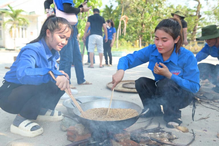 Đoàn xã Khánh Đông thi phần thi ẩm thực với món gà nướng ống tre.