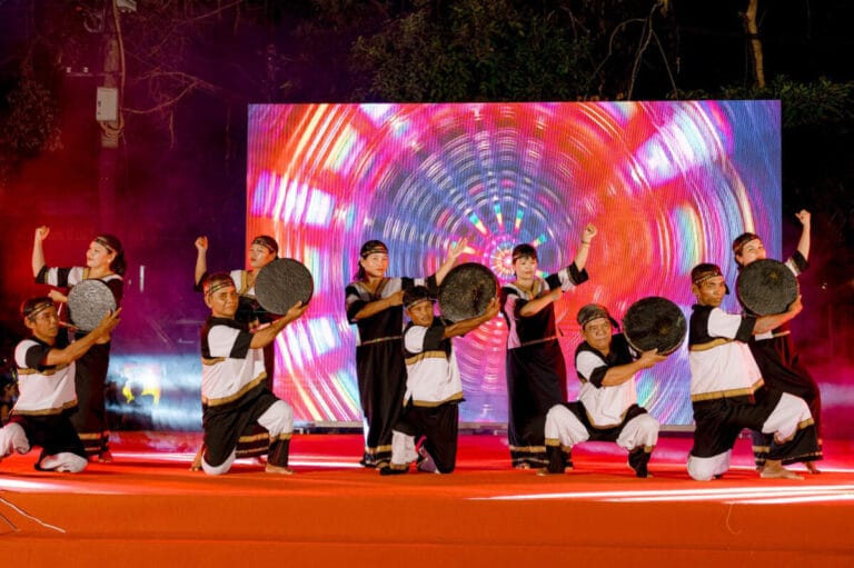Các nghệ nhân biểu diễn với mã la, nhạc cụ truyền thống của người Raglai.