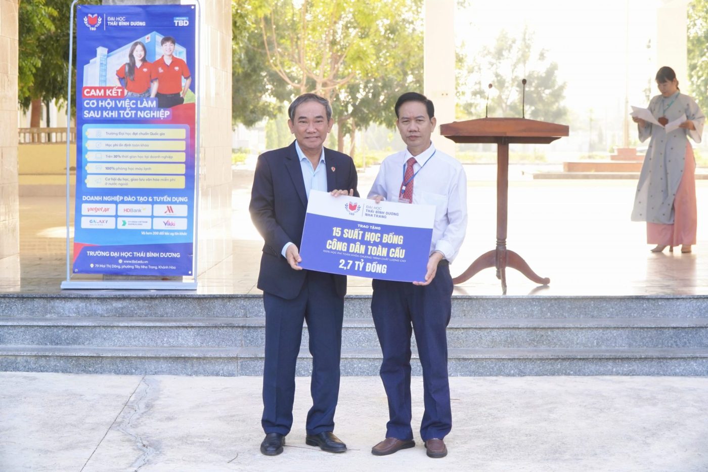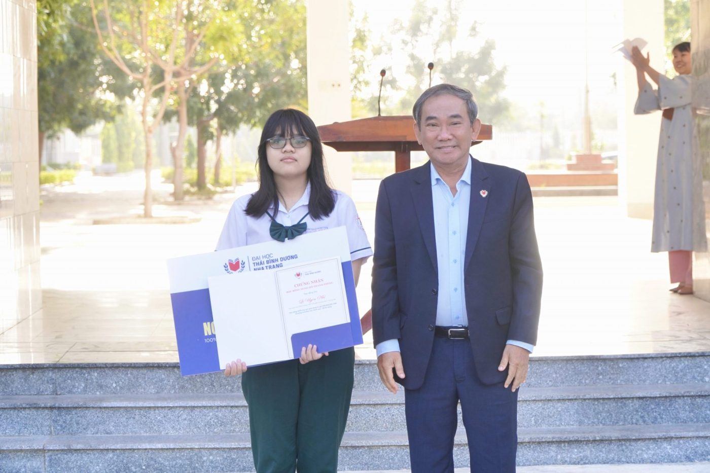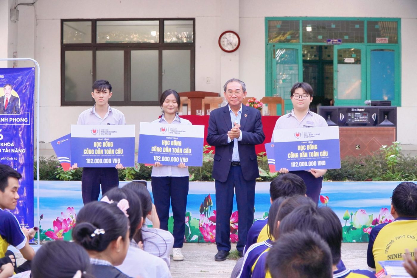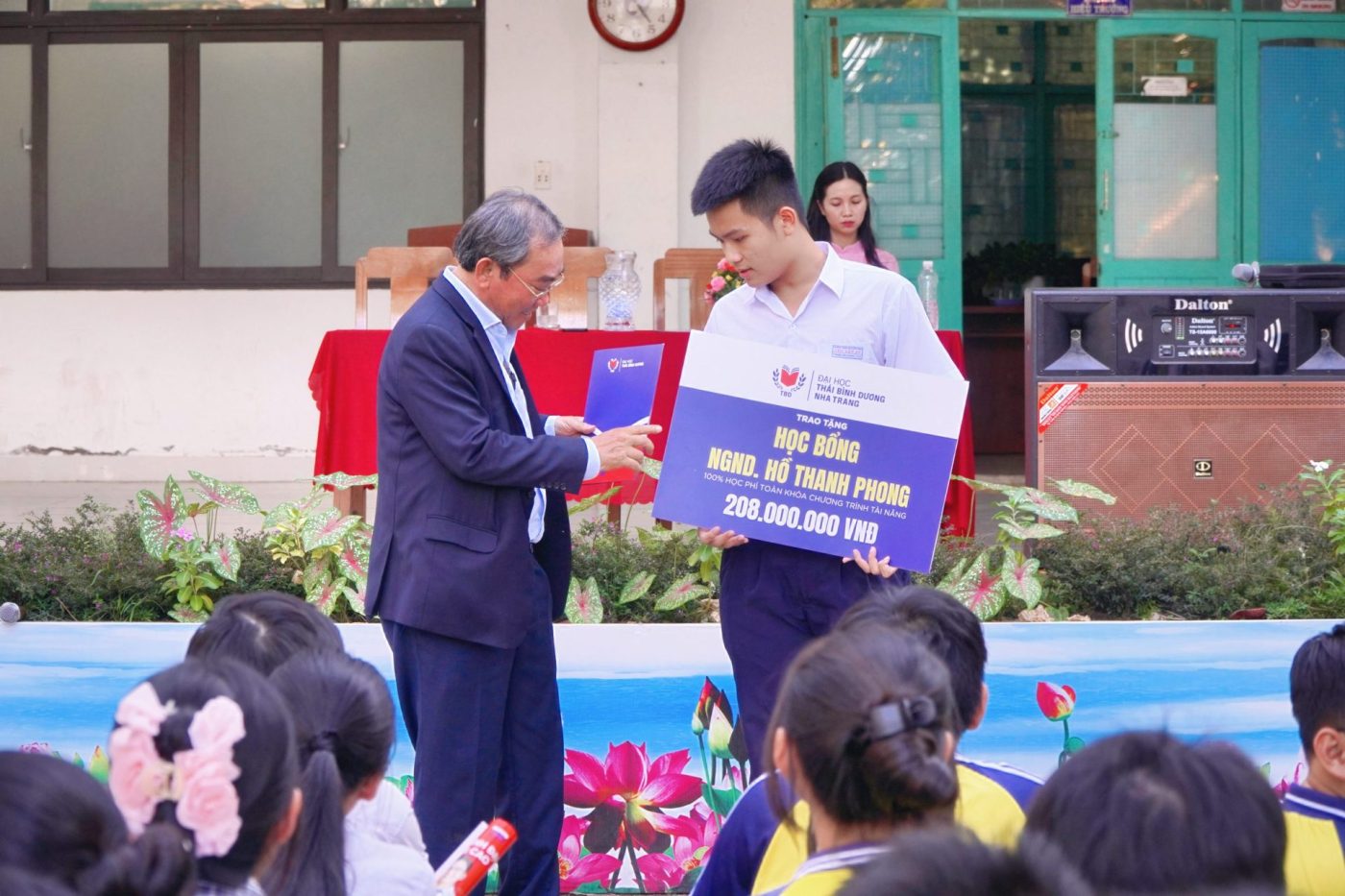 At Le Quy Don High School for the Gifted – Dong Hai Campus, People’s Teacher, Assoc. Prof. Dr. Ho Thanh Phong – President of the University of the Pacific Ocean – personally attended and presented meaningful scholarships. Specifically, the University awarded 01 People’s Teacher Ho Thanh Phong Scholarship to Le Uyen Nhi – Grade 12 English-major class, along with 15 “Global Citizen Scholarships” with a total value of up to VND 2.7 billion.