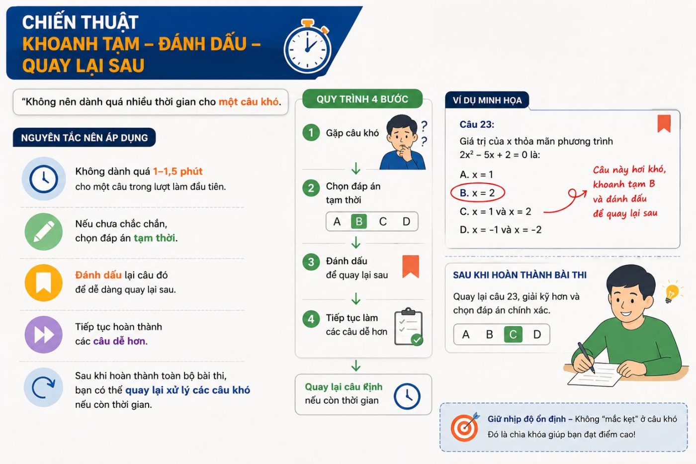 Sau khi hoàn thành toàn bộ bài thi, bạn có thể quay lại xử lý các câu khó nếu còn thời gian. Cách này giúp bạn duy trì nhịp độ ổn định và tránh mất điểm ở những câu dễ.
