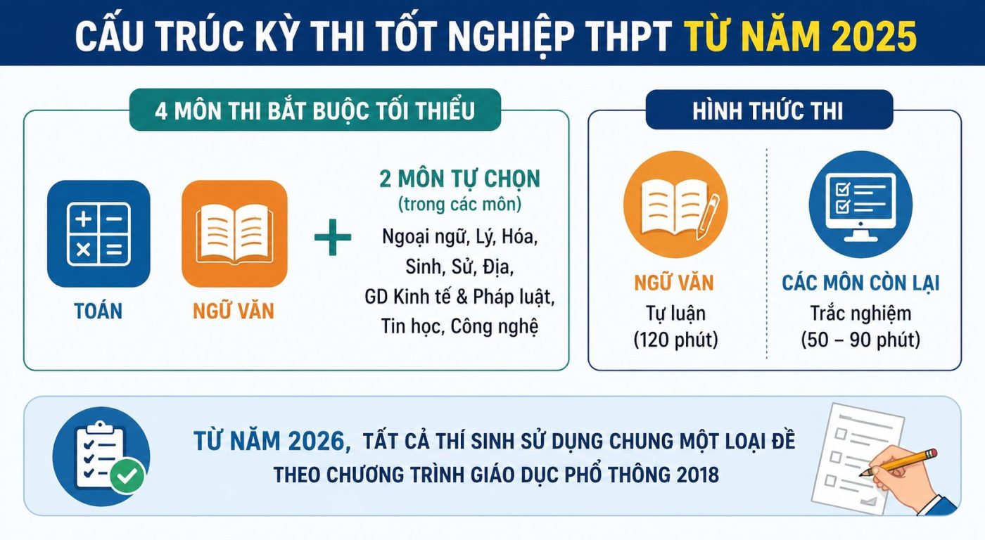 Cấu trúc kỳ thi tốt nghiệp THPT từ năm 2025: 2 môn bắt buộc, 2 môn tự chọn, hình thức thi rõ ràng giúp thí sinh dễ dàng định hướng ôn tập hiệu quả.