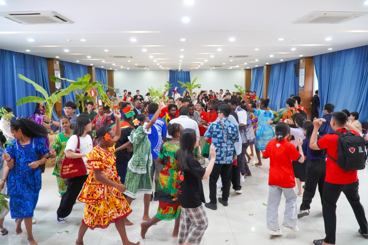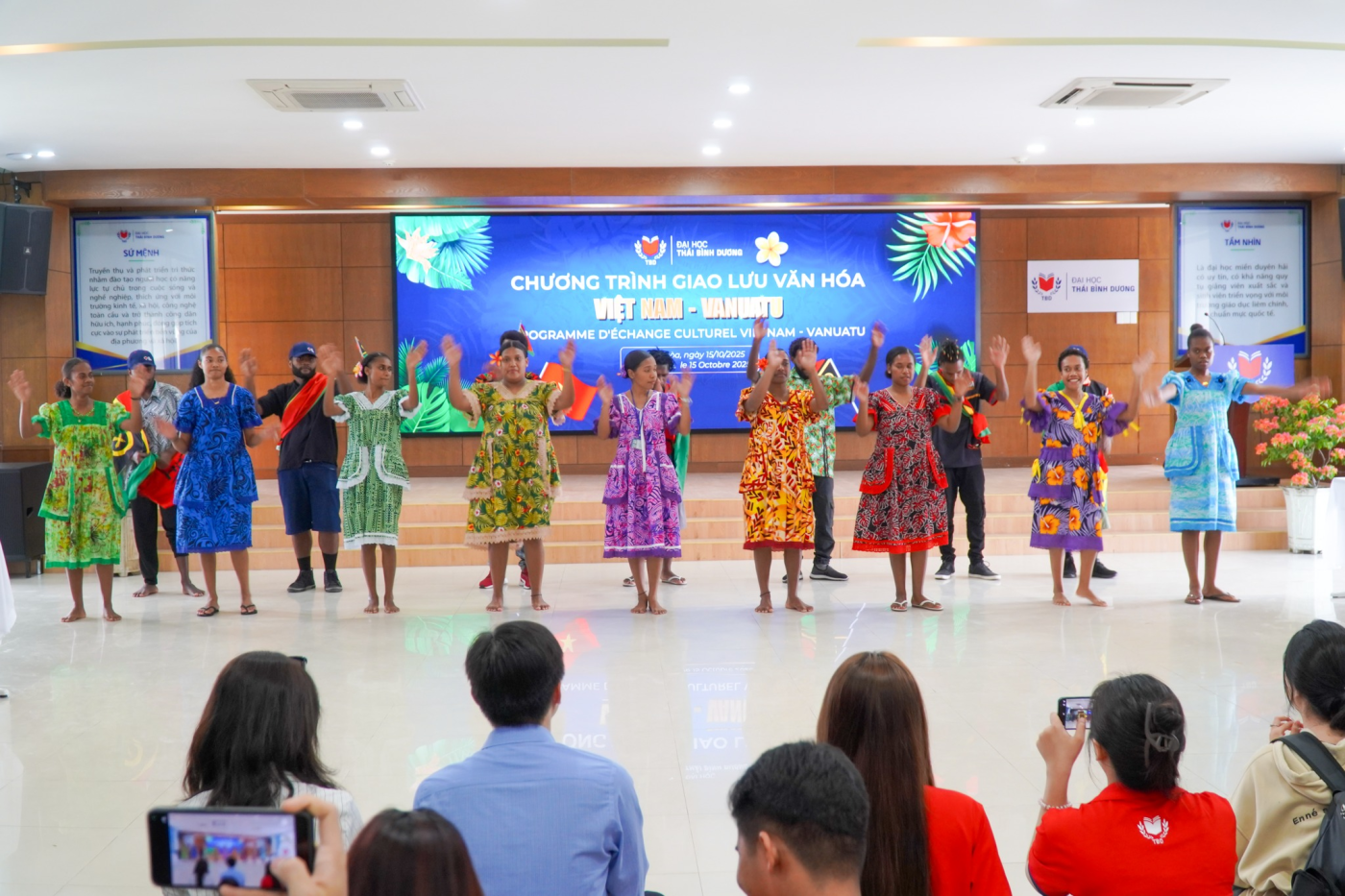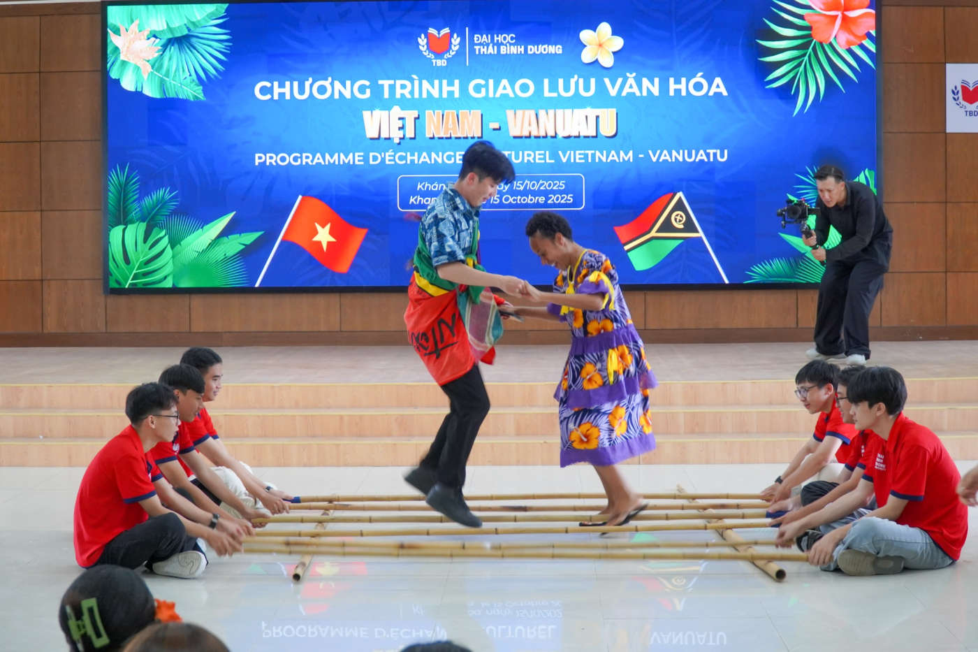 Đáp lại tình cảm đó, sinh viên TBD đã trình diễn những điệu múa dân gian uyển chuyển và đặc biệt là điệu Nhảy sạp vô cùng sôi động. Hoạt động này đã nhanh chóng trở thành tâm điểm của sự kiện khi các bạn sinh viên Vanuatu được mời tham gia cùng. Những bỡ ngỡ ban đầu nhanh chóng được thay thế bằng tiếng cười giòn giã và những bước chân hòa nhịp, tạo ra sự thích thú tột độ cho sinh viên cả hai nước. Khoảnh khắc cùng nhau vượt qua những thanh tre đã xóa nhòa mọi khoảng cách, trở thành minh chứng sống động cho sự giao lưu và gắn kết.
