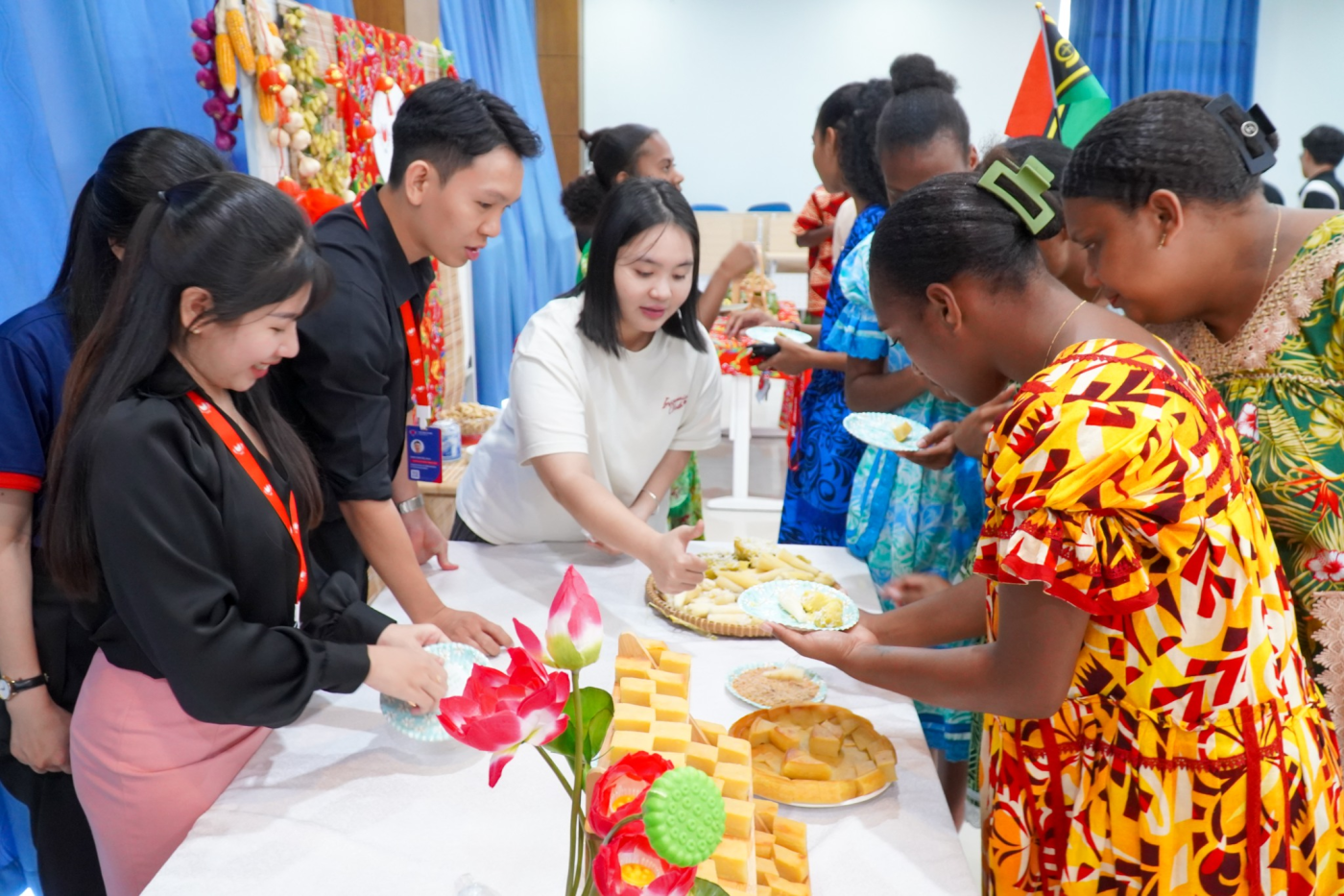 Đặc biệt, các “đầu bếp” đến từ Vanuatu đã chiêu đãi bạn bè hai món ăn truyền thống vô cùng đặc sắc là Laplap và Bunia, mang đến một trải nghiệm vị giác mới lạ và thú vị. Về phía chủ nhà, sinh viên Việt Nam đã giới thiệu những món ăn quà vặt vô cùng dân dã, gần gũi nhưng không kém phần độc đáo. Các món bánh đa dạng như bánh chuối, bánh đậu xanh, bánh khoai mì, bánh ít cùng khoai, đậu phộng luộc và các loại nước giải nhiệt như nước sâm, nước mía đã giúp các bạn sinh viên Vanuatu hiểu thêm về sự phong phú và tinh tế của ẩm thực đường phố Việt Nam.