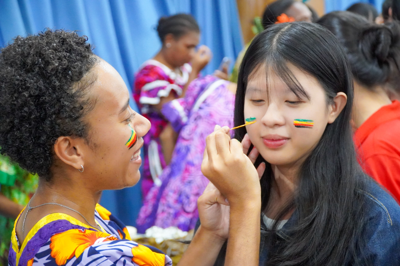 Một trong những hoạt động được yêu thích nhất chính là vẽ cờ lên mặt. Các bạn sinh viên Việt Nam và Vanuatu đã tự tay vẽ lên má nhau những lá cờ nhỏ xinh của hai quốc gia. Hoạt động đơn giản nhưng đầy ý nghĩa này đã thể hiện sự tôn trọng, yêu mến và tinh thần đoàn kết. Những khuôn mặt rạng rỡ với hai lá cờ Việt Nam – Vanuatu kề bên nhau đã trở thành biểu tượng đẹp nhất cho tình bạn trong buổi giao lưu.