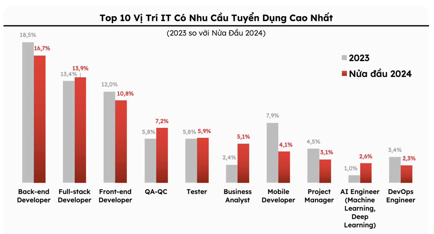 - Back-end và Full-stack Developer tiếp tục dẫn đầu với 56.1% công ty có kế hoạch tuyển dụng.