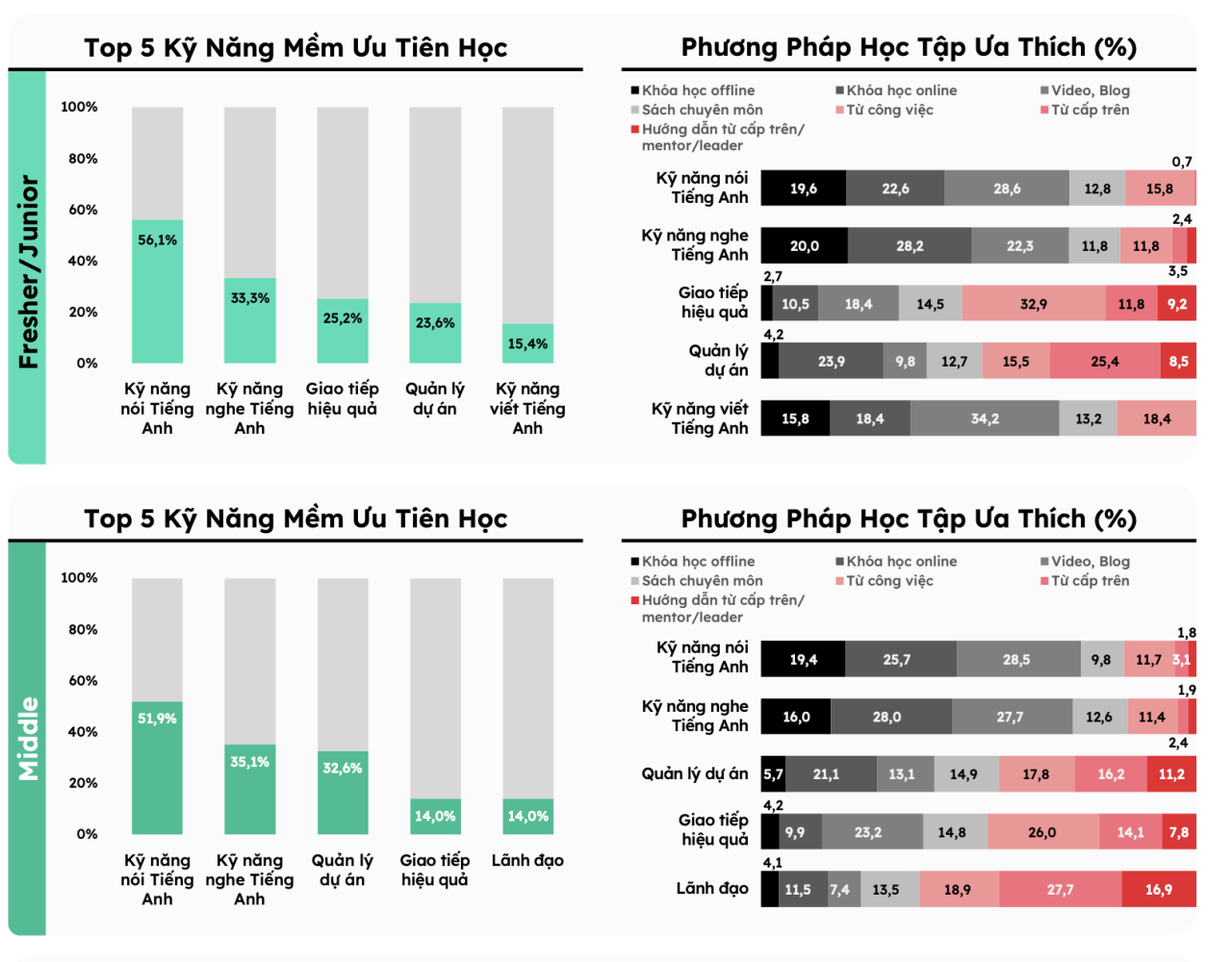 Tuy nhiên, kỹ năng chuyên môn không phải là tất cả. Báo cáo nhấn mạnh một “khoảng trống” lớn về kỹ năng mềm, đặc biệt là Tiếng Anh. Các nhà tuyển dụng xếp hạng trình độ tiếng Anh là kỹ năng mềm được yêu cầu hàng đầu (40.3%). Bên cạnh đó, các kỹ năng như giải quyết vấn đề (72%), tư duy logic (62.5%), và làm việc nhóm (60.6%) vẫn luôn được đánh giá cao.
