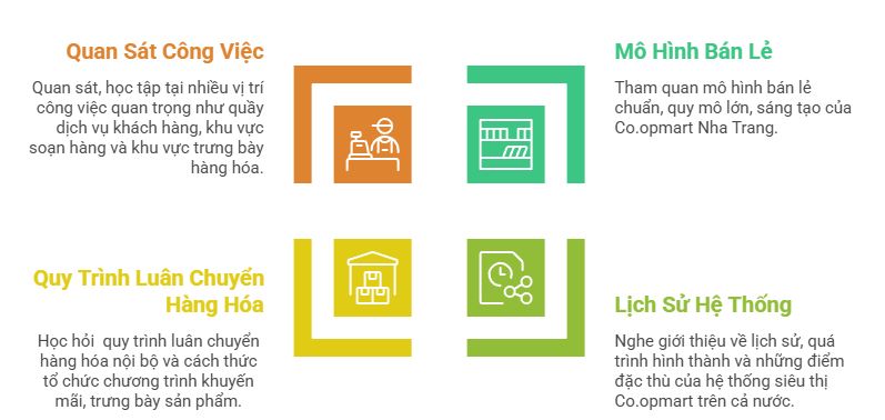 • Quan sát, học tập tại nhiều vị trí công việc quan trọng như quầy dịch vụ khách hàng, khu vực soạn hàng và khu vực trưng bày hàng hóa.